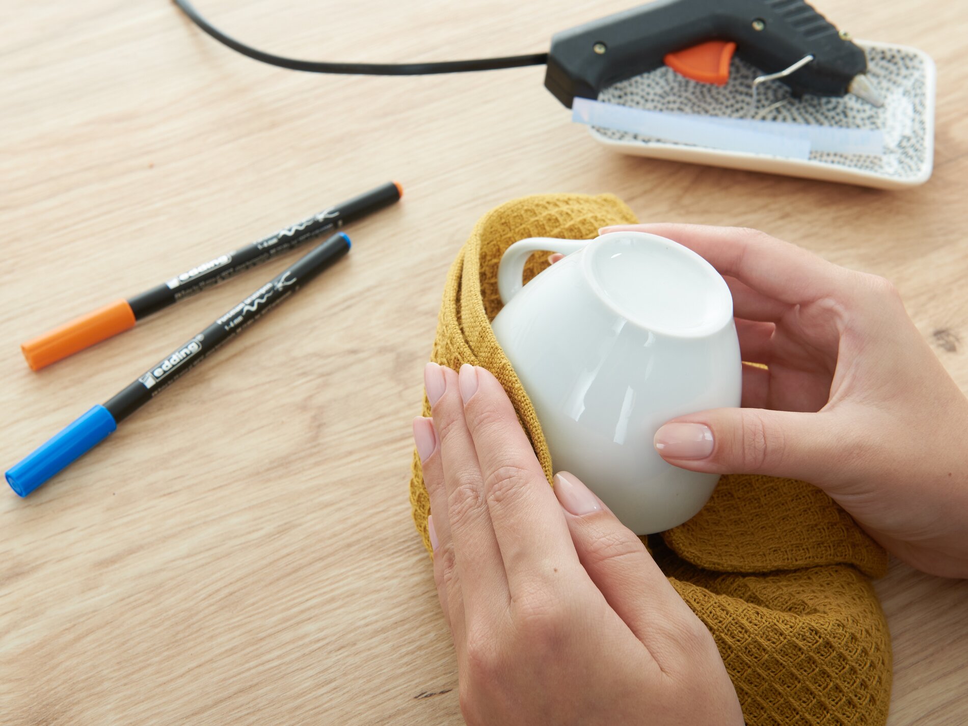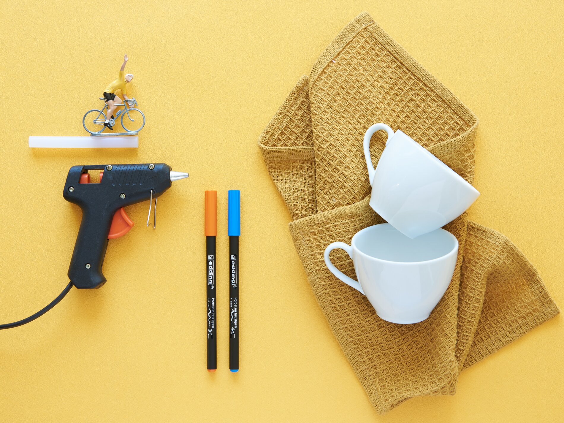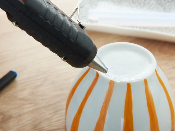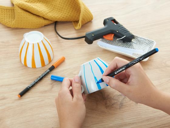 All you need for this idea are porcelain cups (preferably the same ones), a hot glue gun and edding 4200 Porcelain Brushpens.