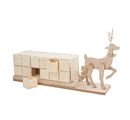 A wonderful VBS Advent Calendar "reindeer with sleigh" with a length of approx. 52.5 cm, height 29 cm (including antlers), width 12 cm. The reindeer carries a small bell around its neck. The 24 small gift boxes are approx. 5.2 cm x 5.7 cm in size and the inside dimensions are approx. 4.3 cm x 5 cm. The material is a mixture of wood and MDF wood