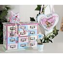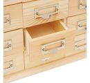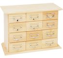 Practical pharmacy cabinet with 12 small drawers - ideal for storing small items such as jewellery, cosmetics, office utensils and much more. Labelling fields with small recessed metal handles provide a clear overview. The perfect living accessory for the country house style. The metal labels can be unscrewed to make designing and labelling easier.