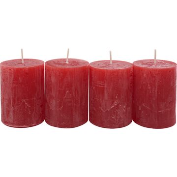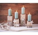 VBS Wooden candleholders in a set of 4 with a length and width of 8.5 cm in the heights 12 cm, 15 cm, 20 cm and 23.5 cm (measured including the mandrel). Equipped with rust-coloured candle plates with mandrel for pillar candles. The plates have a Ø of 7,5 cm