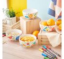 With porcelain painting pens and paints, the cereal bowls can be decorated in colour from the outside. With the help of stencils the most different motives can be applied. Now you can add your own name and everyone will have their own individual breakfast bowl.