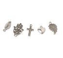 The set VBS Charms-Decoration pendant Mix "Give me five" contains 5 silver Decoration pendantmetal charms in different designs. The different motifs of the set are a hand with the dimensions of approx. 2 cm x 1.5 cm, a maple leaf with approx. 1.7 cm x 1 cm, a leaf with approx. 1.6 cm x 0.7 cm, a heart with approx. 1.1 cm x 1 cm and a cross with the dimensions of 1.8 cm length and 1 cm width.