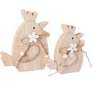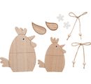 VBS Creative chickens as a set of 2 with bows, wooden beads, wings and flowers to glue on. The size of the chickens is 11.5 x 2 x 14.5 cm and 8.5 x 2 x 11 cm. The material of the chickens is MDF wood, wings and flowers are made of plywood. The flowers are painted white. The set is decorated on one side. In addition, you will need some craft glue.
