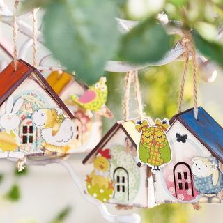 The Craft blanks made of wood are already glued. The roof is equipped with a Jute ribbon and can be lifted. They can be designed in many different variations and later decorated with the hanging tape on branches, at Mobiles.