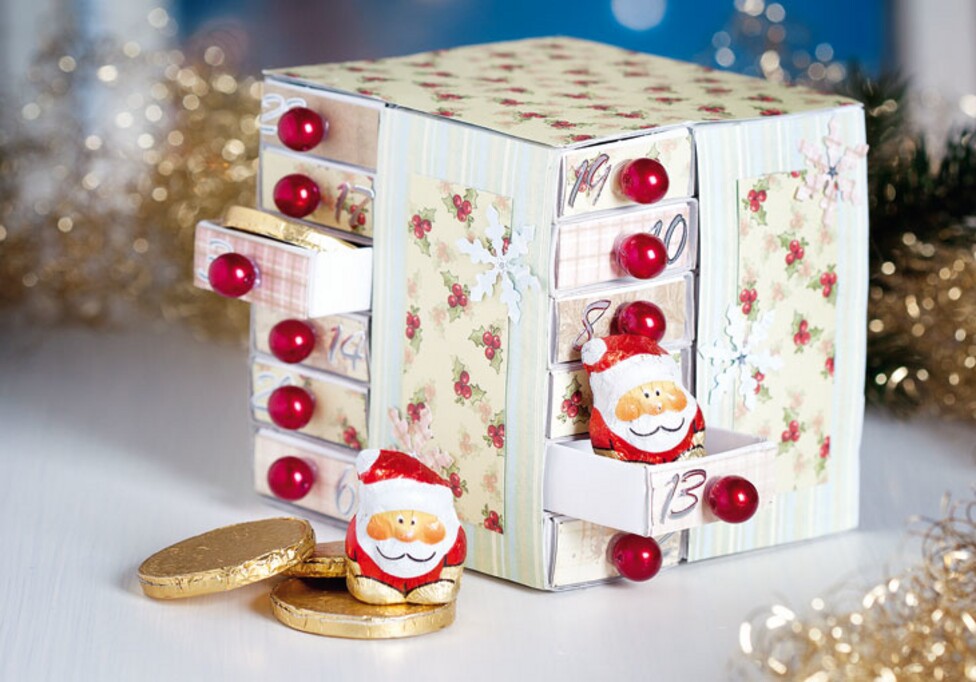 Now decorate your Advent Calendar according to your wishes with the motives of the block by gluing different cut-outs on the sides of the box and the small box fronts. When everything has dried well, attach the beads to the pull-outs with wire by twirling the ends together in the inside of the drawer. You can also use a small needle to prick the holes