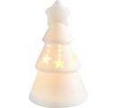 VBS LED fir tree made of matt white porcelain with a warm light. The small tree measures approx. 7.7 x 12.6 cm. It comes with 3 LR44 batteries. The porcelain is unglazed and unpainted.