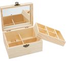VBS Mini jewelry box made of pine wood. The pretty box has a size of about 15 x 12 x 7 cm and is equipped with hinges and a closure made of metal in the color brass. The interior dimensions of the chest are approximately 13.5 x 10.5 with a lid depth of 1.5 cm. Inside there is a compartment for removal and a mirror. In the lower part there are 4 compartments of the same size (about 6.4 x 5 cm). The insert you can take out is about 13.2 x 10 cm with a height of about 2.5 cm, divided into 5 compartments. Of these, 4 compartments are the same size at 4.5 x 4.5 cm, depth 2.4 cm and 1 compartment is approx. 2.7 x 9.3 cm, depth 2.4 cm.