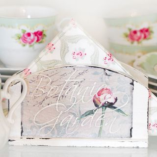 The napkin holder can be designed individually, e.g. with colour or the napkin technique. The holder measures a width of about 15 cm, a height of about 9 cm and a depth of about 7 cm.