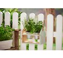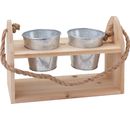 A beautiful VBS plant pot hanger with 2 pots made of zinc and a jute cord. The plant pot hanger is made of wood with a size of approx. 28.5 x 13 x 19 cm and a thickness of approx. 1 cm. The zinc pots have a Ø of approx. 10 cm at the top and 7.1 cm at the bottom. The inner Ø at the top is approx. 9.5 cm. A thick jute cord is attached to the top of the wood.
