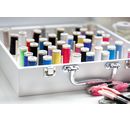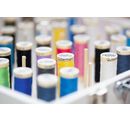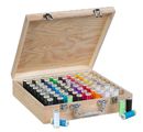 Inside the case there is an insert plate and wooden pens. These are inserted into the pre-drilled holes of the insert plate and thus provide space for a maximum of 64 bobbins of sewing thread .