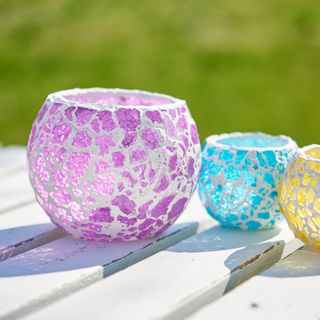 A perfect Glass for tea lightsone for the design with different materials. Whether with effect colors spotted, painted with Chalky Color or with Hobby Color colors and Leaf metal occupied. All is permitted that pleases. With different beads, bowsedit, Mica, light chains and metal pendants is an individual Wind light design.