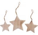 Beautiful VBS Wooden decoration pendant stars as a set of 3 with a size of approx. 8.7 cm, 11 cm and 14 cm. The thickness is approx. 15 mm. The stars are made of high quality wood and have rounded edges. Eyelets are attached at the top with a jute ribbon for hanging.