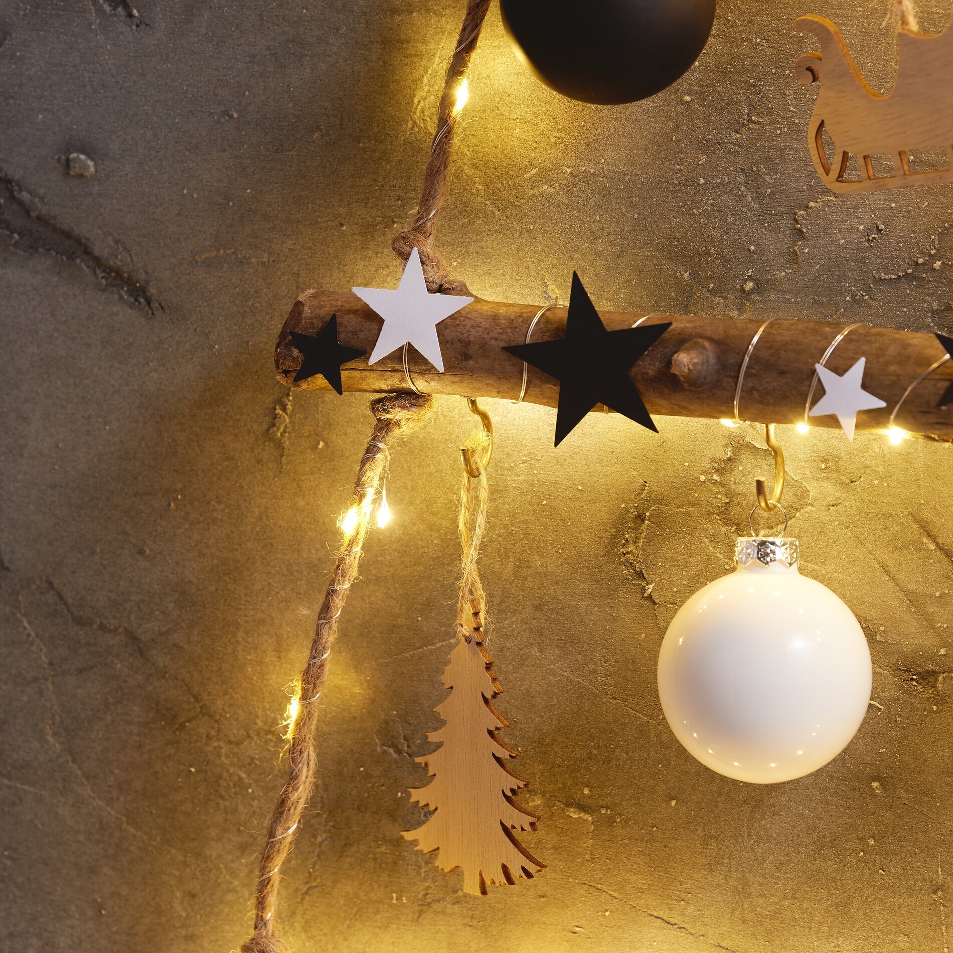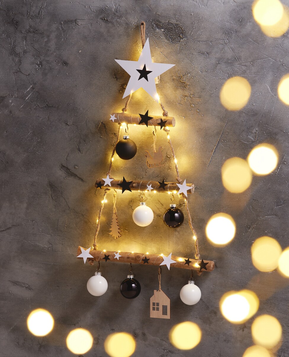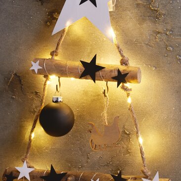 First, wrap the chain of light around the individual pieces of wood of the driftwood-fir tree and fix them in place with a little hot glue. Glue the battery compartment into the top of the driftwood-fir tree using the hot glue gun. Make sure that the batteries can be easily replaced later.