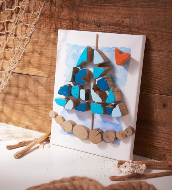 Arrange for Driftwood ..in front of him to sail ships. Cut the round bar to a length of approx. 24 cm and position it as a mast. Round driftwoods are ideal as mosaic pieces for the hull of a ship.