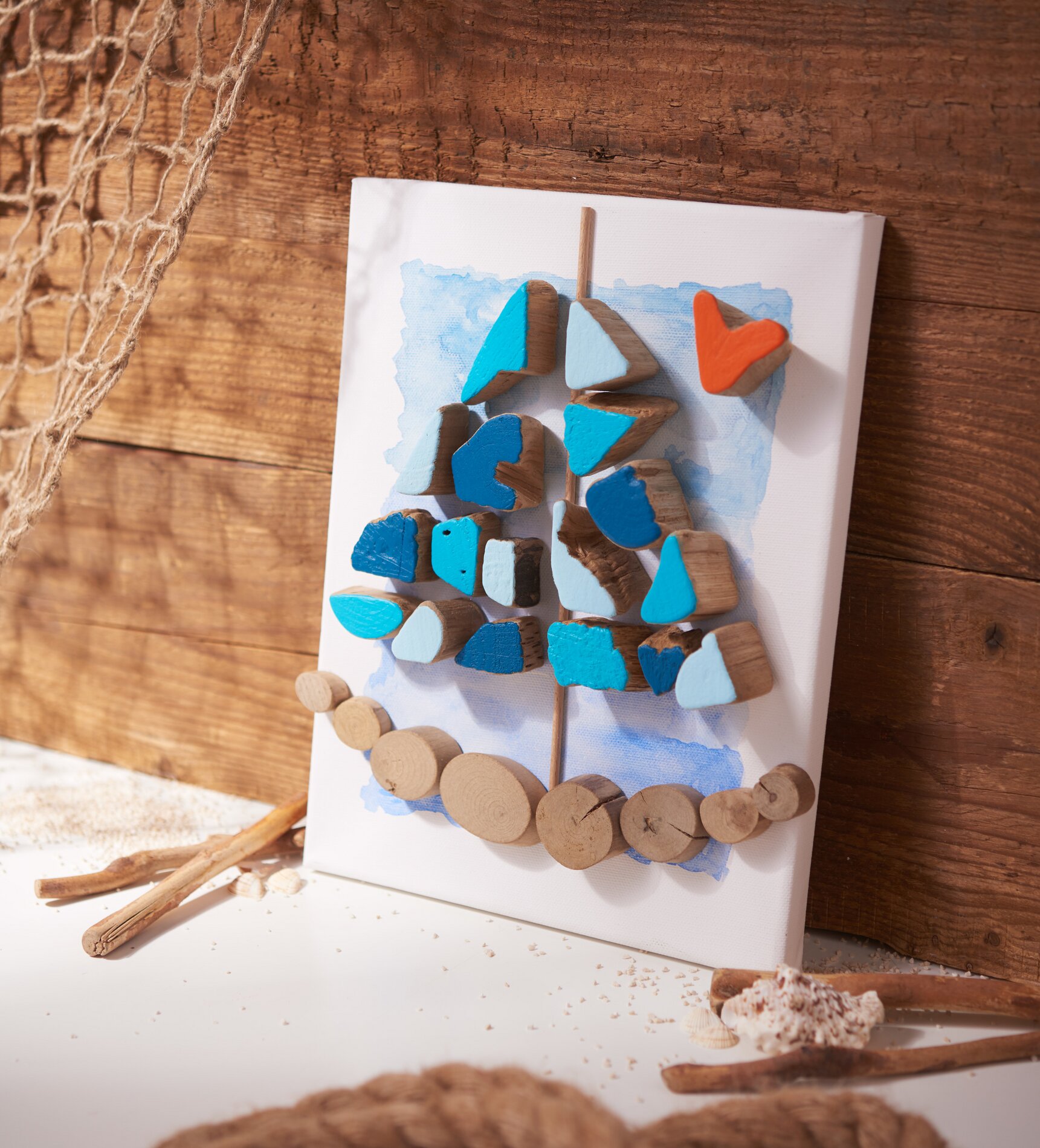 Once you are satisfied with the laying pattern, paint the surfaces of the wood in different shades of blue. To give your picture a harmonious colour contrast, use orange paint to turn another matching piece into a flying seagull.