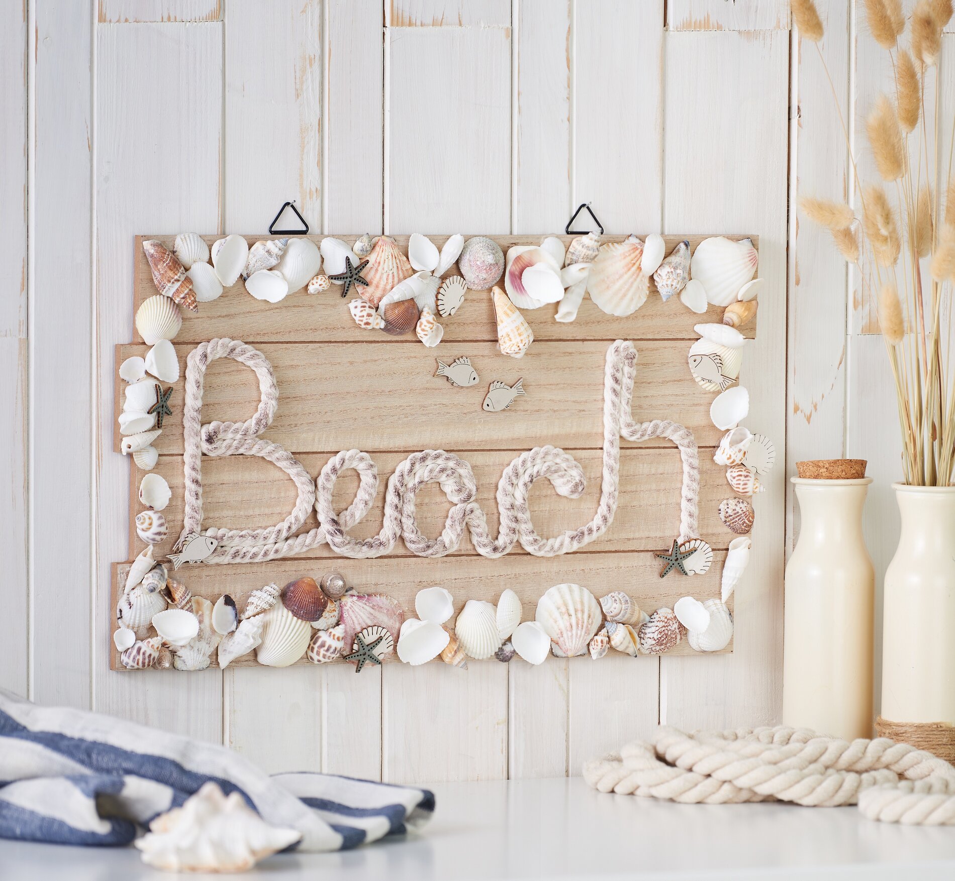 Now it's time to get creative! Frame the lettering with shells and small scattered pieces that are reminiscent of the beach. Arrange the shells loosely around the word 'beach' and add small scatter decoration to give your beach wall sign more structure and dimension. Fix all the decorative elements with hot glue.
