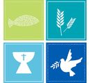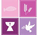 The whole motive has a size of 6,5 x 6,5 cm and the single coloured squares have a size of 2,9 x 2,9 cm. The motifs - fish, ears of corn, chalice and dove are depicted, which symbolize four elements of faith.