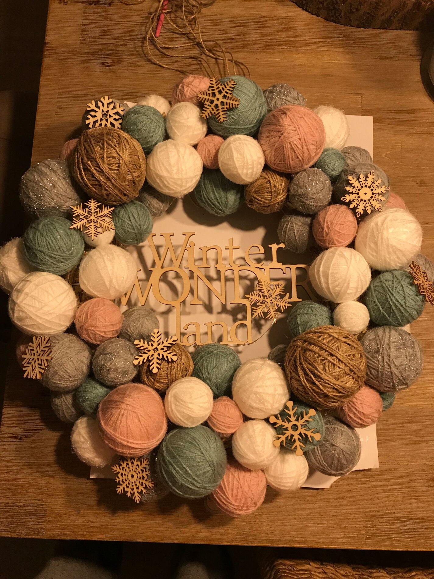 The basis for this door wreath is a flat Polystyrene ring. Now wrap differently coloured wool around differently sized Polystyrene ballsTip: Spread some of the Polystyrene ball Handicraft glue and wrap it around the ball. Thus the first layer is Polystyrene ball attached to the Wrap until the bauble is completely covered with wool and fasten the rest of the wool again with Handicraft glue. The finished wool baubles are attached to the wreath with some hot glue.