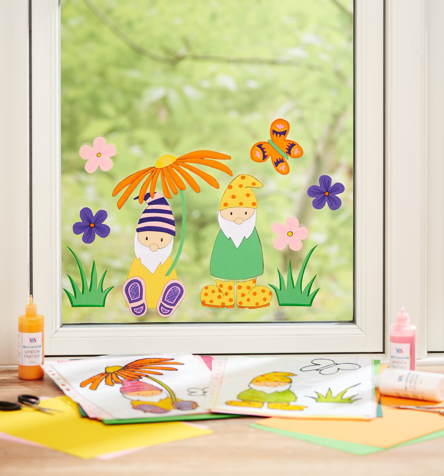 Colorful window decoration spring gnomes