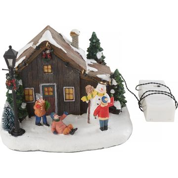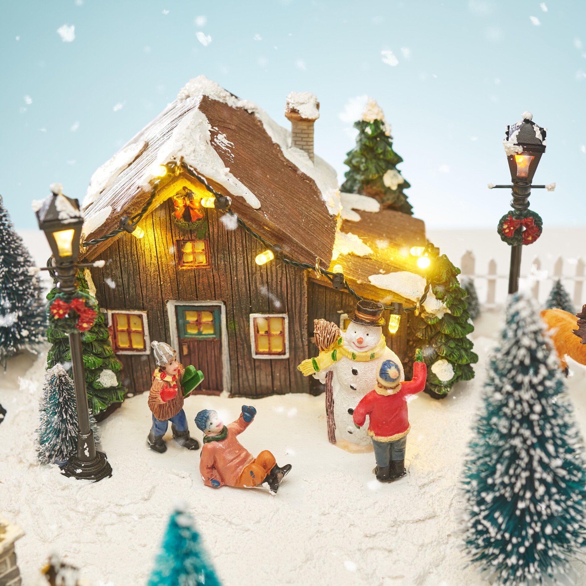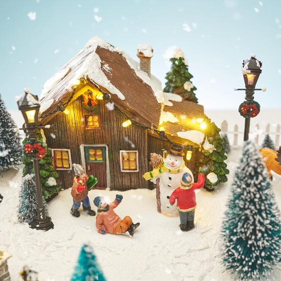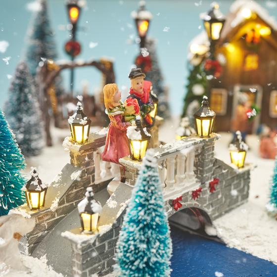 Once the decorative snow has dried and the miniatures are firmly in place, you can add further decorative accents. Apply decorative snow to the lanterns, bridge and the roofs of your miniature landscape to give them a wintry touch.