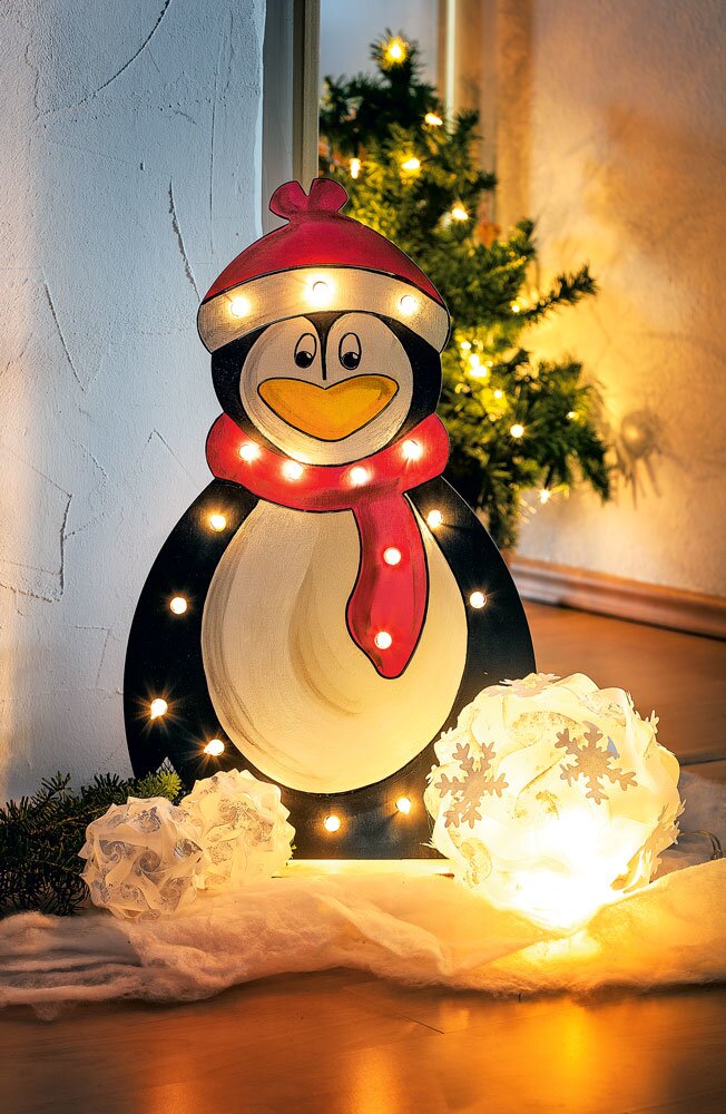 This penguin feels comfortable even in the warmth. This wooden figure can be beautifully decorated with colours and because of the already existing cut-outs for the fairy lights, it provides a real point of light in the wintertime.