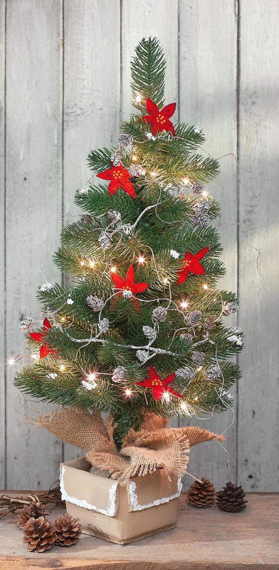 Wrap the fairy lights and the pine cone garland around the Fir.