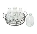The Wire basket with 6 glass bottles is a unique accessory that will brighten up your home. The wire basket consists of a sturdy metal frame and 6 glass bottles in different sizes. The bottles have openings with a diameter of 2 x 3.7 cm, 2 x 2.3 cm and 2 x 1.9 cm. The basket has a diameter of 25.5 cm and a height of 13.5 cm. The wire basket comes in a beautiful shade of black and goes well with any interior.