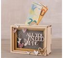 "All you need is love" is a charming gift idea for wedding invitations, golden wedding, silver wedding, for couples in love or as a motto for life. So the money gifts are really well received! Design the money box with Chalky Color, trend colours or handicraft colours. With scattered parts, pearls and glittering stones you can still set accents. Also a decoration with Motif paper, Napkin or Straw silk paper is possible. A micro LED light chain creates the right atmosphere. Put your money present in scene and make the presentee an extraordinary joy