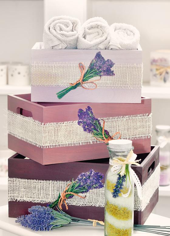 Neatly and clearly stowed away and still nice to look at. Does not go you think? And how! With these wooden boxes and a little paint you will immediately get a fresh breeze into your home. The Jute ribbon and the filigree Napkins-motifs give the arrangement its typical country house look and let you hide a lot inside.
