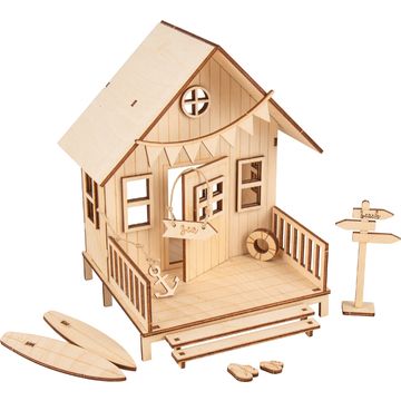 With 36 parts made from FSC-certified plywood, this kit offers you endless possibilities for individual design. Paint, glue or spray your beach house however you like. After decorating, simply put it together and fix it with some craft glue (not included) to give your work stability.