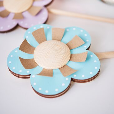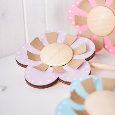 Take three cut-out kraft paper-flowers and glue a wooden platine in the middle of each one.