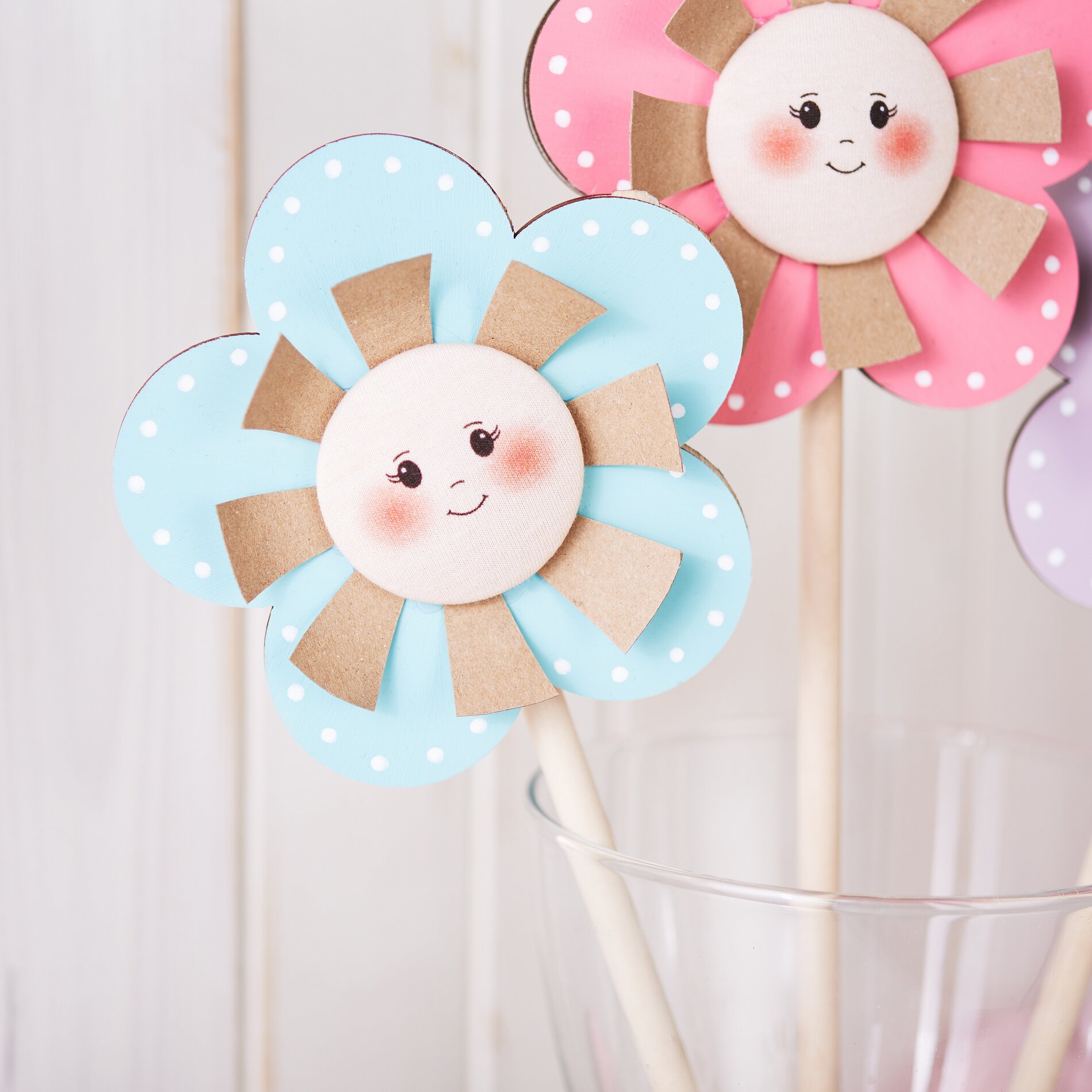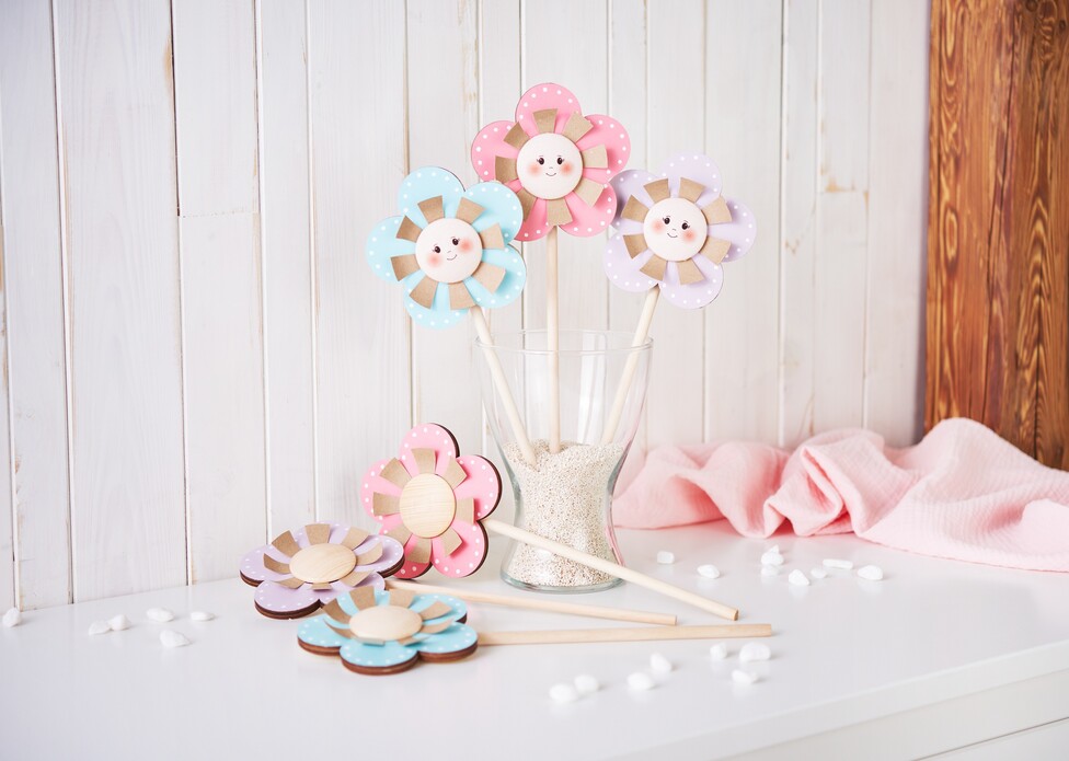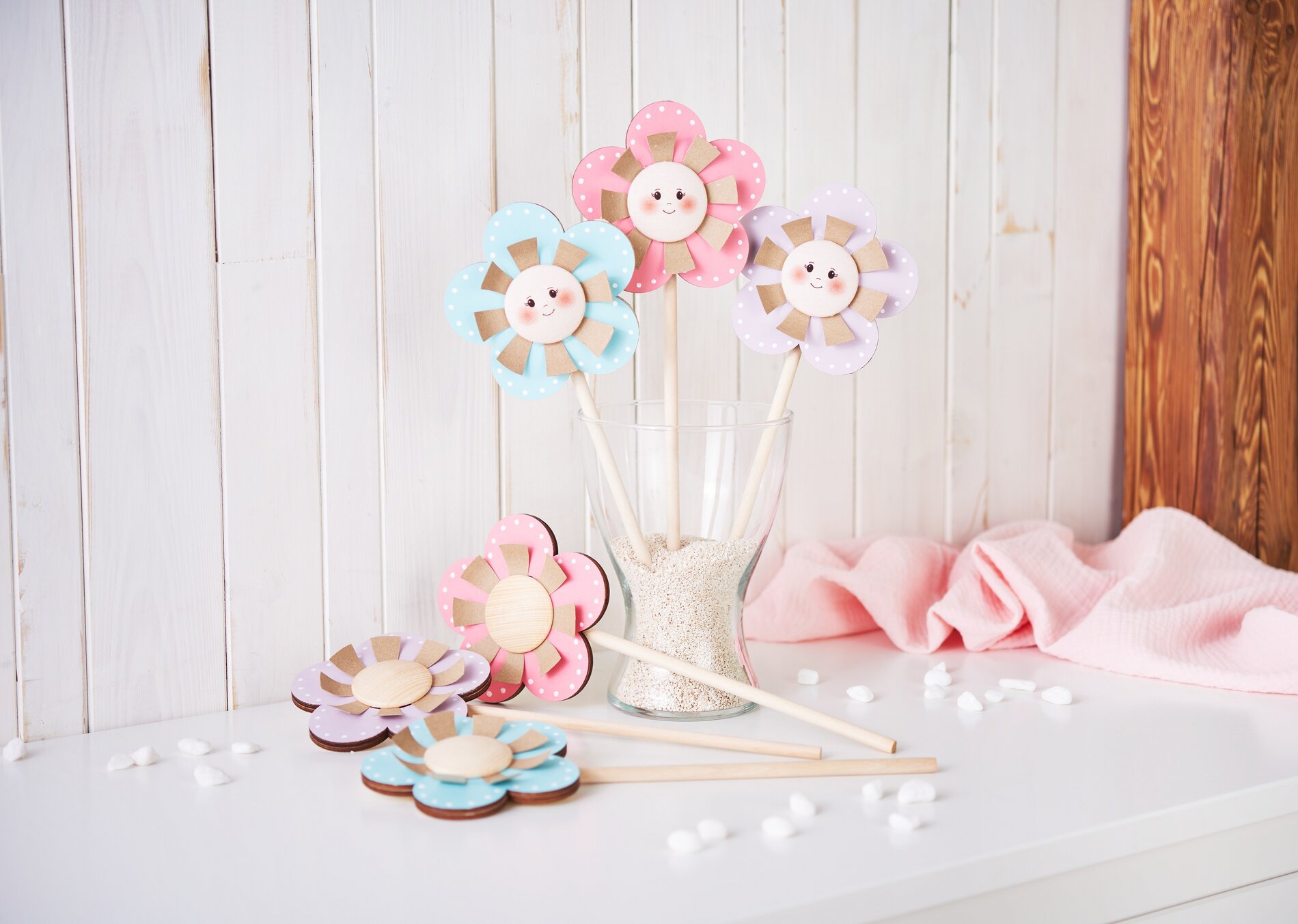 Now glue the prepared kraft paper-flowers with the wooden board faces in the middle of the painted flowers. Make sure that everything is firmly attached to prevent it from moving.