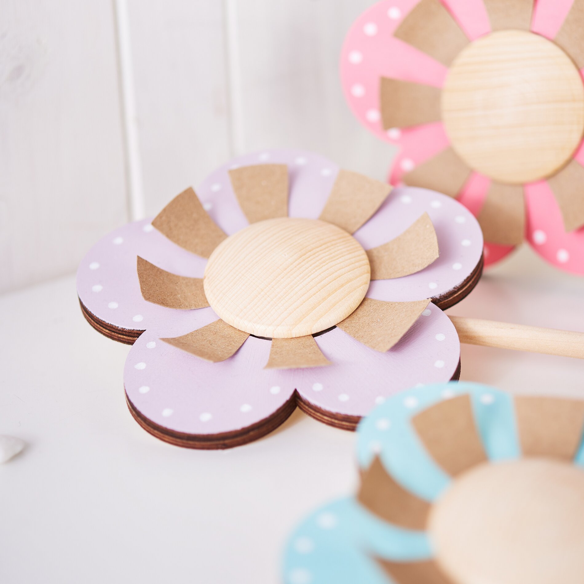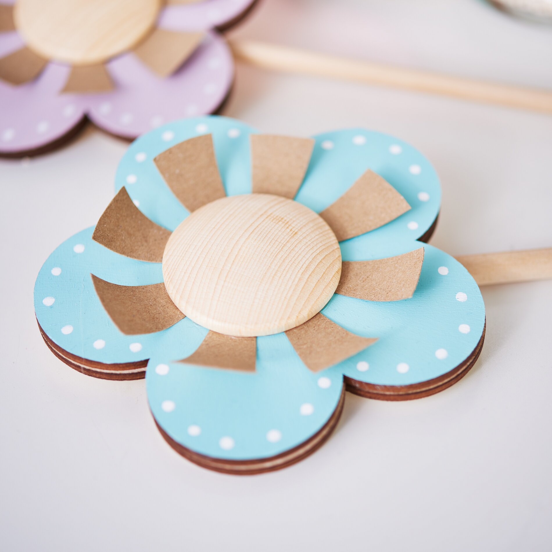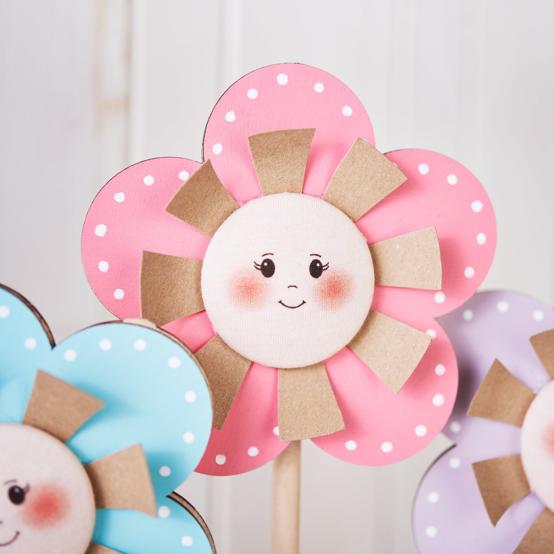 Now glue the prepared kraft paper-flowers with the wooden board faces in the middle of the painted flowers. Make sure that everything is firmly attached to prevent it from moving.