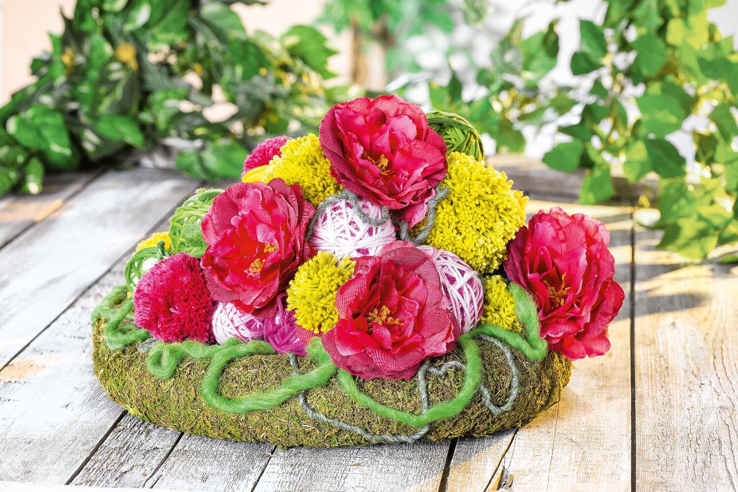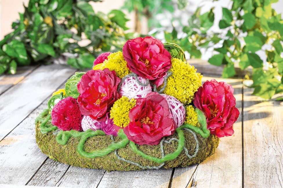 The colorful wool balls and Pompoms you can now arrange them pyramid-like on the moss wreaths with the help of plug wires. Finally, cut the stems of the roses with a side cutter and add the flowers to your creative arrangement.