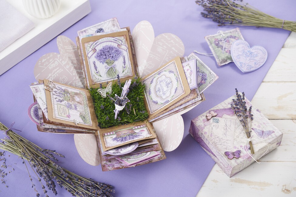 Uprostřed krabice jsme vytvořili poutavou zahradu z travnatých stuh a miniaturních prvků. Za tímto účelem nalepte do středu krabice travní stuhu a doplňte ji levandulovými květy. Miniaturní kolo jsme nastříkali levandulovou barvou, aby ladilo s krajinou Provence. Nalepte kolo do trávy a ozdobte jej bíle natřeným kbelíkem s řídítky, levandulovými květy a posypem.