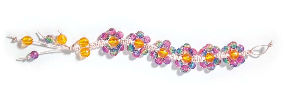 uvažte 4 celé tkalcovské uzly a na každou z vnějších zauzlovaných šňůr navlékněte 3 třpytivé korálky a na obě vnitřní šňůry navlékněte oranžový akrylový korálek.