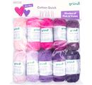 Gründl Cotton Quick Mini "Odstíny růžové a fialové" je harmonicky sladěná kombinace 10 háčkovacích přízí od světle růžové přes růžovou až po tmavě fialovou. Každé klubíčko je vyrobeno ze 100% bavlny, váží přibližně 15 g a jeho běžná délka je přibližně 37,5 metru. Příze je mercerovaná, plyšová a česaná. Pro optimální zpracování se doporučuje velikost jehly 3 - 4.