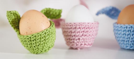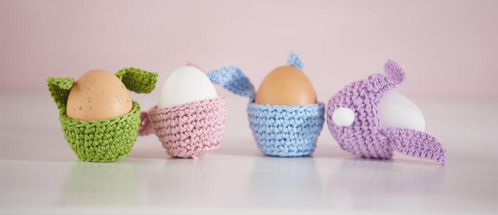 K tomuto háčkování budete potřebovat vlnu Catania. Z jednoho klubíčka příze a jehlic č. 4 vyrobíte přibližně 6 vajíček. Háčkujete dvěma přízemi najednou. Nejenže tak získáte obzvlášť pěkný, pevný a silný vzor stehů - vaše vařená vajíčka budou později lépe držet teplo. Na zaječí uši použijte jehlice č. 3 a háčkujte jednou nití.