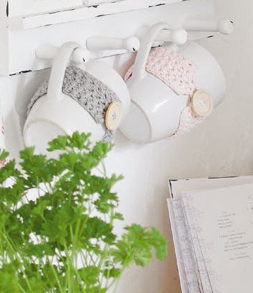 Háčkovat 28 řetízkových ok. V první řadě začněte jednoduchými oky háčkovanými do druhého řetízkového oka od háčku. Háčkujte jednoduchými oky až do konce, utvořte otočné řetízkové oko a uháčkujte je ve výšce asi 4 cm a oko odháčkujte. Nyní uháčkujte na jedné úzké straně smyčku z řetízkových ok a na opačné straně přišijte knoflík. Nezapomeňte, že knoflík by měl smyčkou projít a nesmí být příliš volný, aby později okraj zůstal na šálce na svém místě. Všechny nitě sešijte. Hotovou háčkovanou obrubu jednoduše umístěte kolem šálku a zapněte ji na knoflík.
