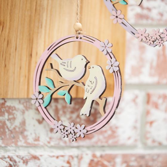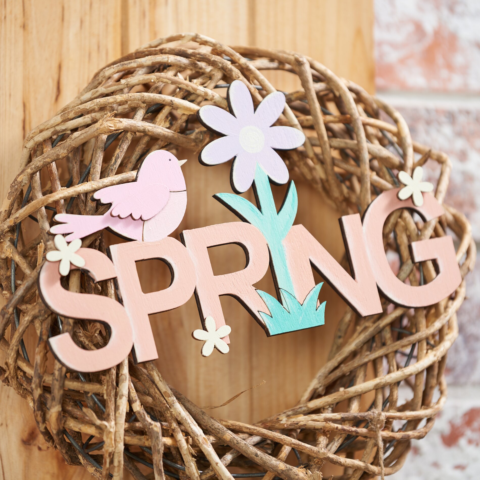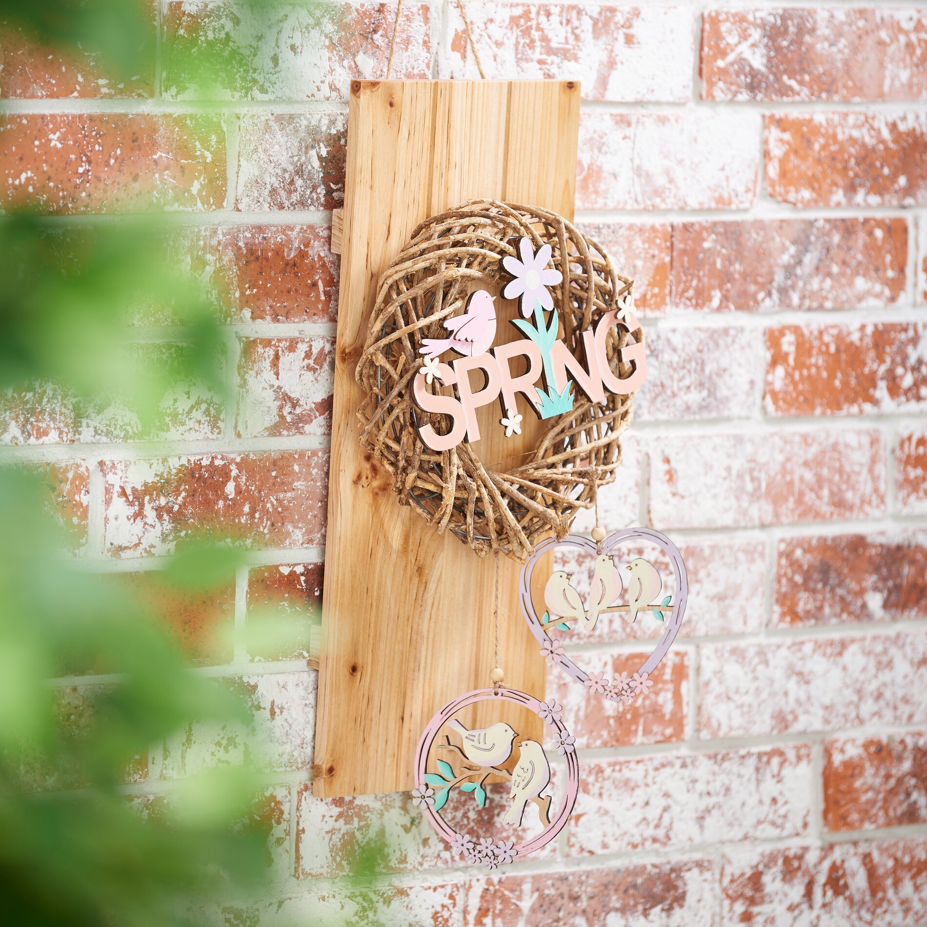 Nyní, když je věnec zavěšený, můžete na věnec přivázat dřevěné nápisy a malované dřevěné přívěsky.