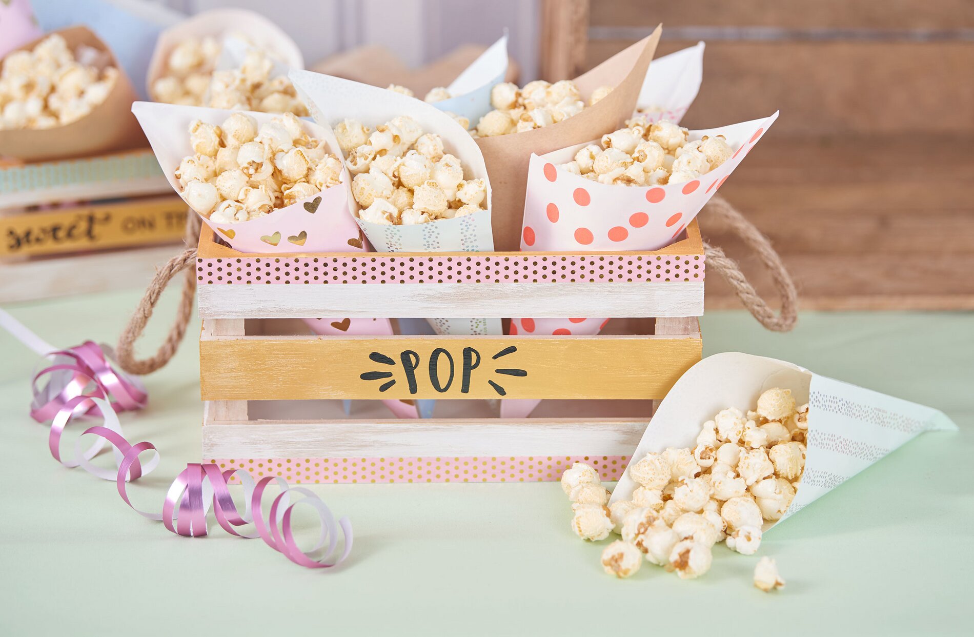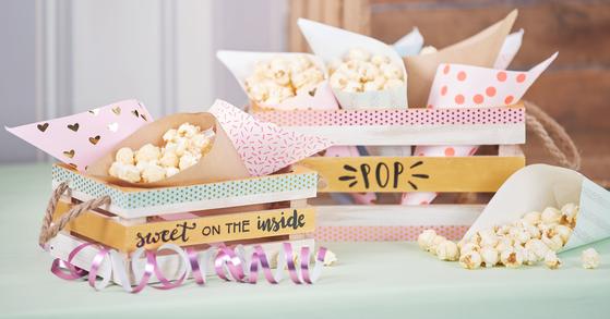 Pro naše stylové krabičky na popcorn vezměte ozdobnou dřevěnou krabičku a natřete ji barvami podle vlastního výběru, zde například krásnými pastelovými barvami Hobby Color. Na krabičky můžete také psát a nalepit na ně washi pásku. Pro sáčky na popcorn si můžete vybrat z našich krásně sestavených sad nebo si je sami vyrobit z krásného papíru.