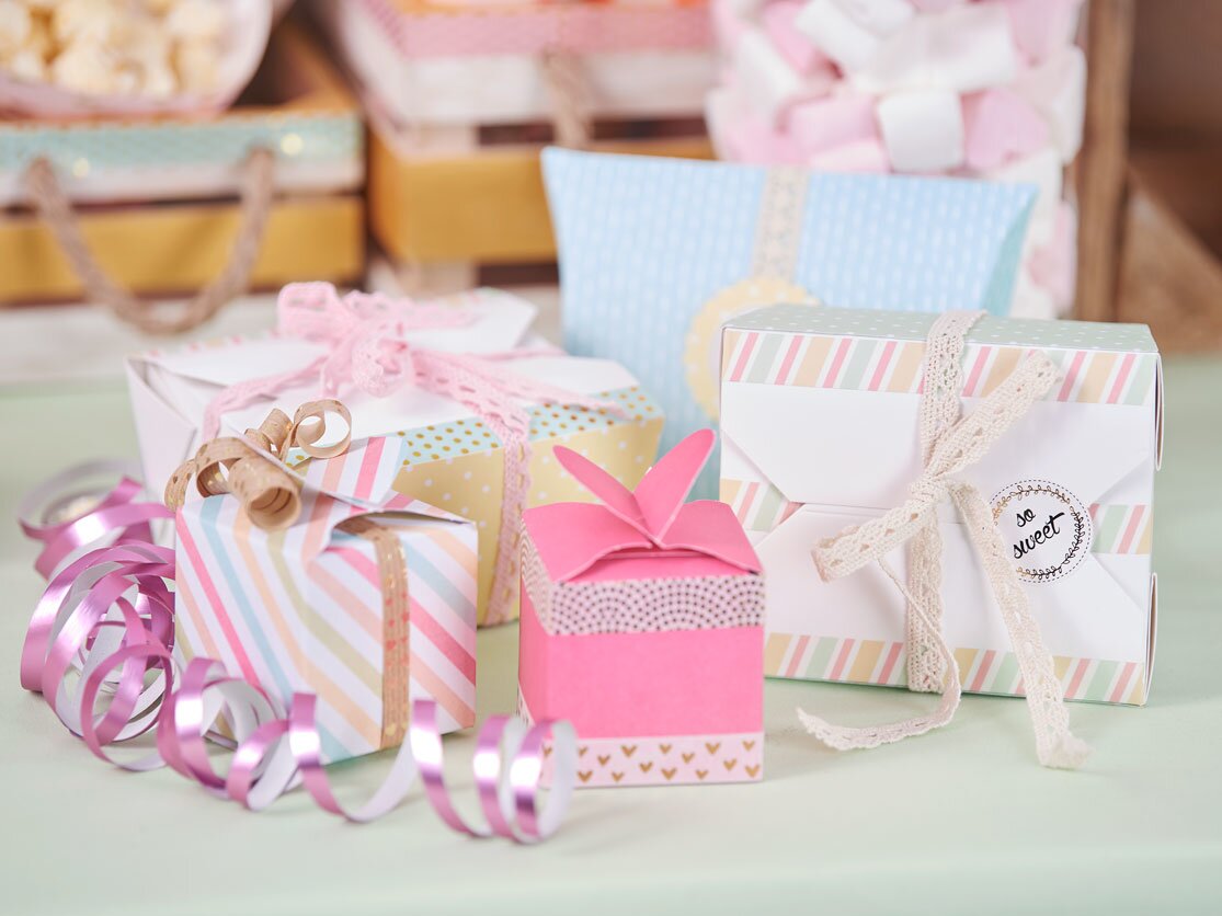 Krabičky můžete snadno vyrobit v různých velikostech a barvách. Nabízíme vám širokou škálu sad, šablon na krabičky, děrovaných listů na krabičky a mnoho dalšího. Můžete vytvořit krásné efekty pomocí štítků, stuh, washi pásky a samolepek a krabičky můžete přizpůsobit dané příležitosti a zvolenému barevnému tématu.
