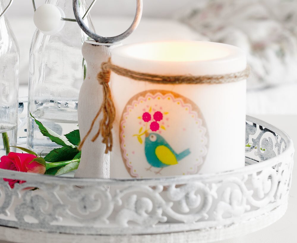 A je to tak jednoduché:  Motivy vystřihněte z ubrousku a horní potištěnou vrstvu přilepte na střed svíčky pomocí svíčkového potisku. Kolem svíčky uvažte jutový provázek, zauzlujte ho a konce trochu provlékněte.