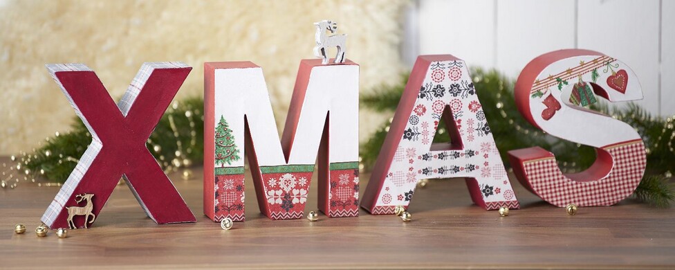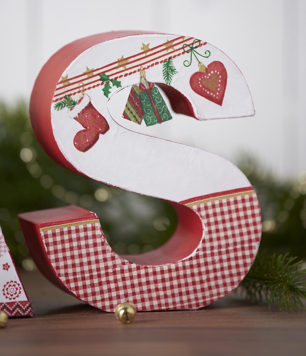 Aby motivy ubrousků vynikly, jsou písmena nalakována dvěma různými barvami: kromě klasické bílé je vánoční barva namíchána z barev karmínově červené a lilkové.
