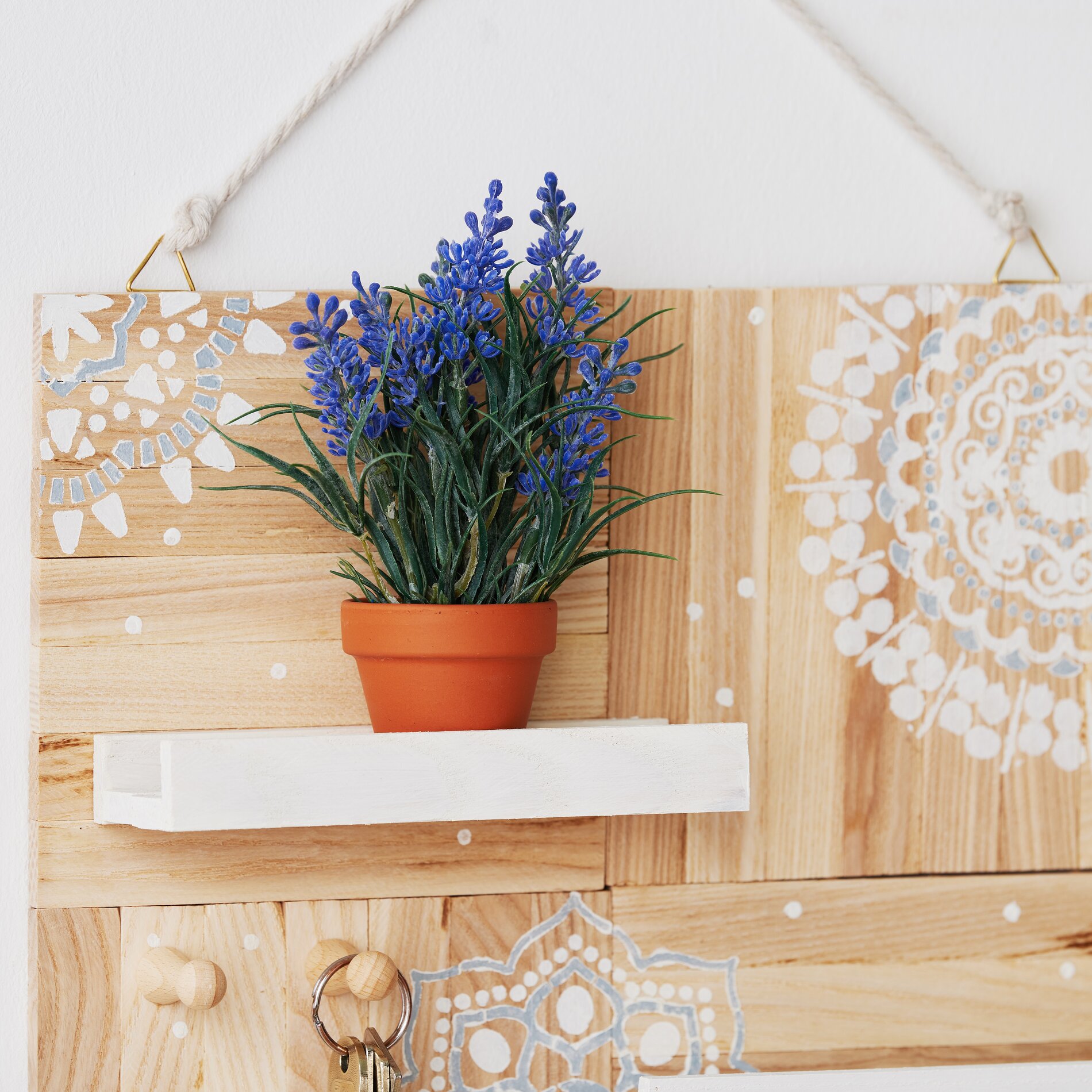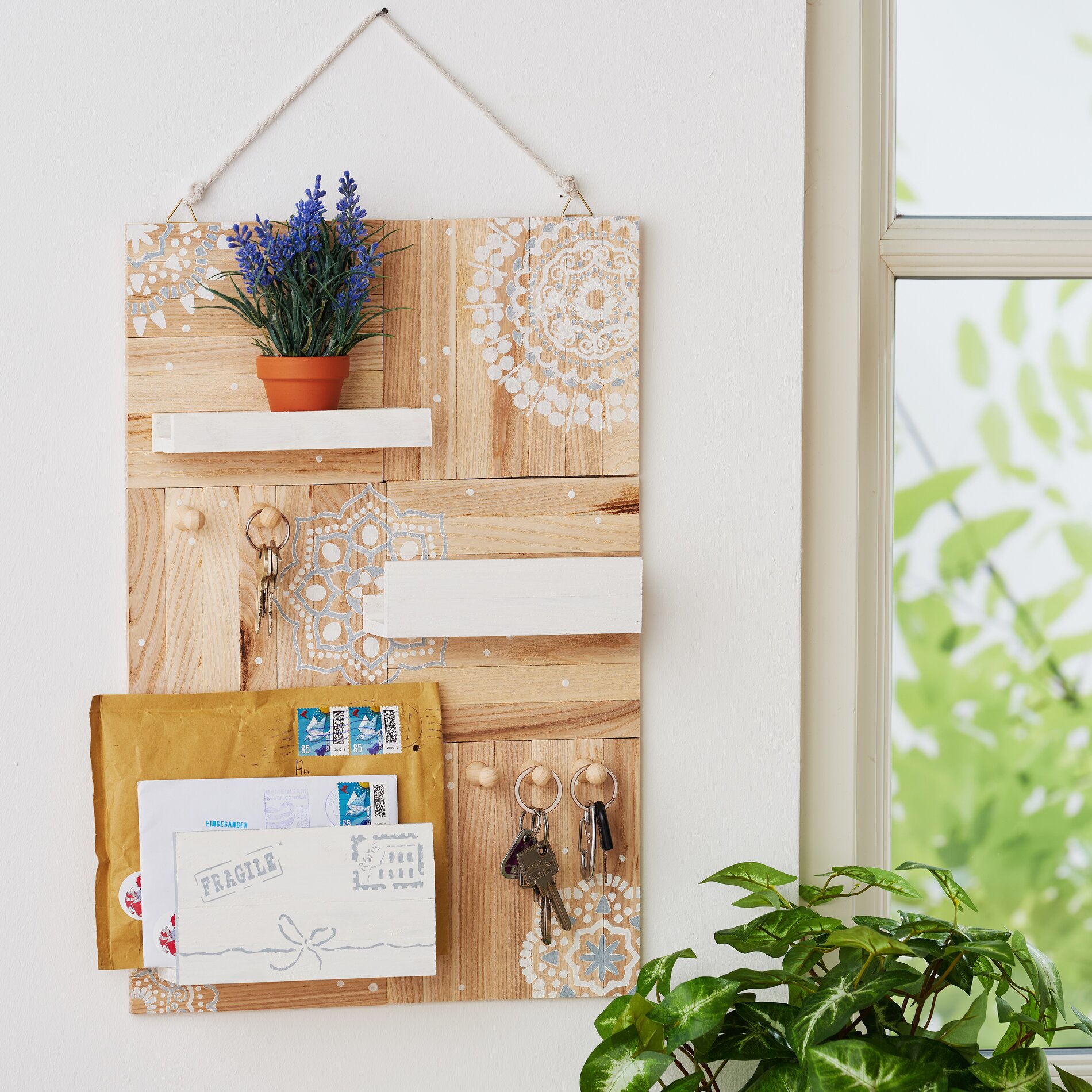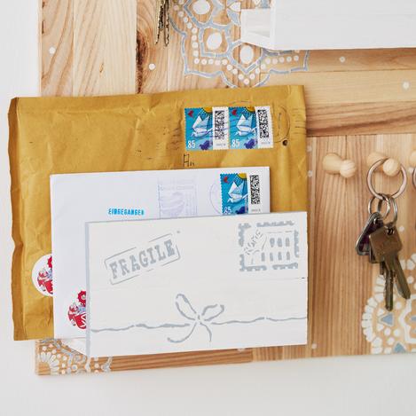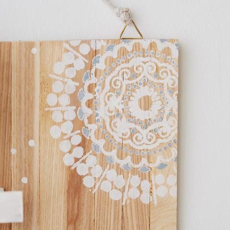 Na malířskou šablonu naneste lepidlo ve spreji a poté ji umístěte na desku. Naberte trochu barvy suchým štětcem a opatrně ji naneste přes motiv na malířské šabloně. Jakmile barvu nanesete, sejměte šablonu a ihned ji očistěte vodou.