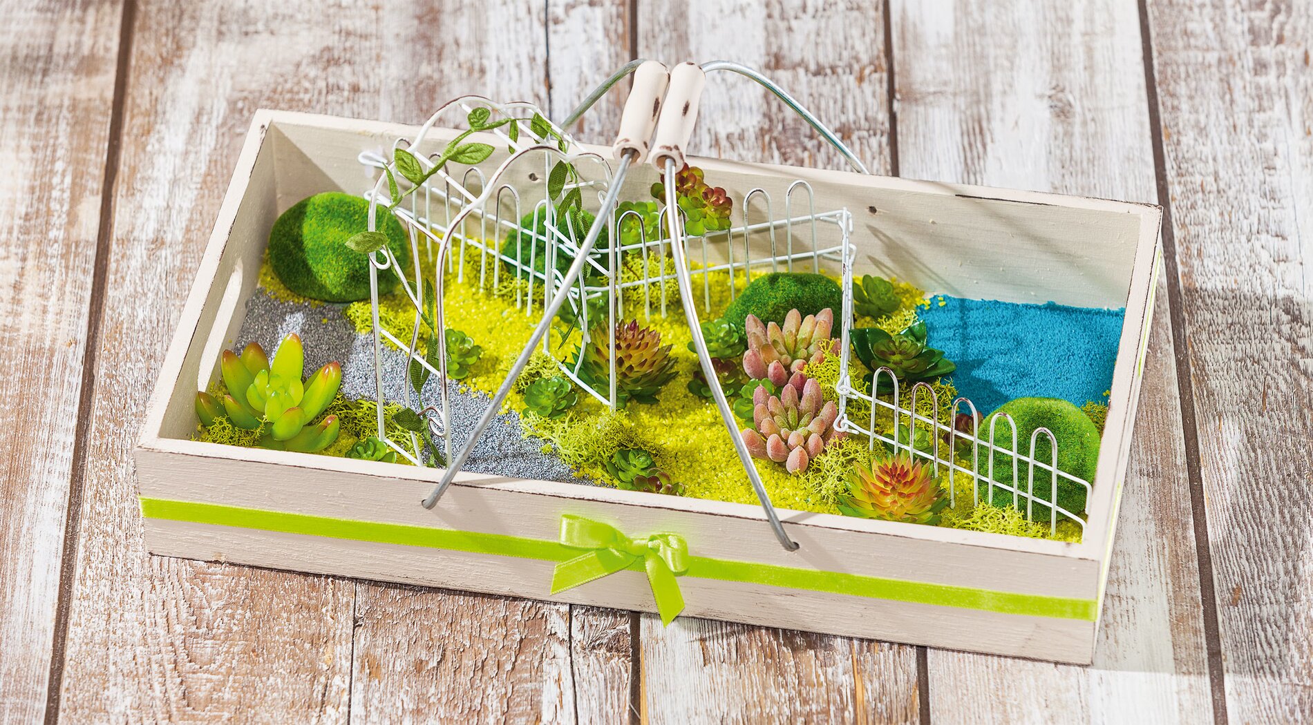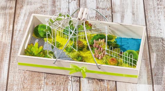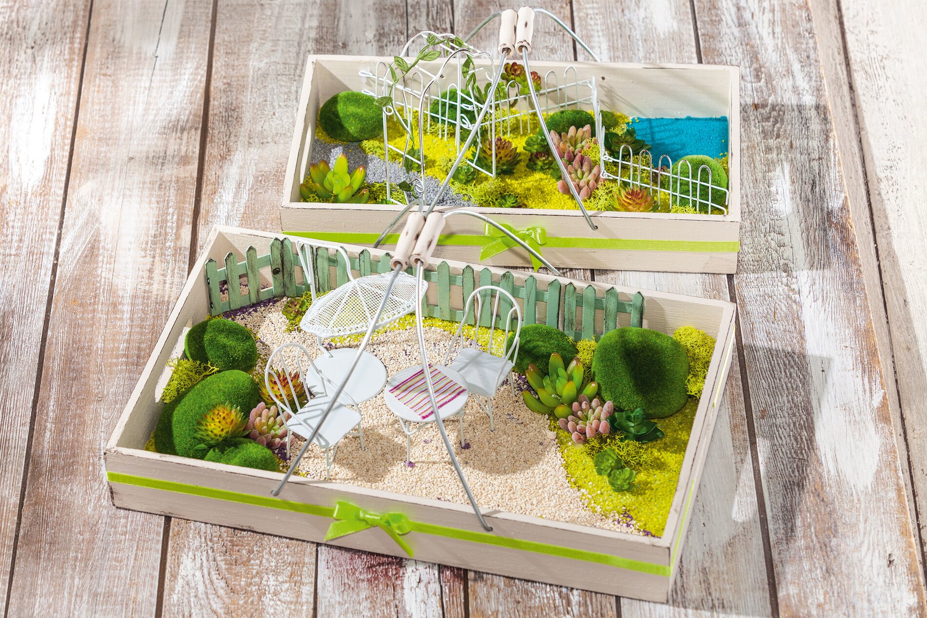 Naaranžujte mech, sukulenty a mechové kameny a zajistěte je pomocí přípravku Keber. Miniaturní zahradní nábytek a ploty doplní zahradu.