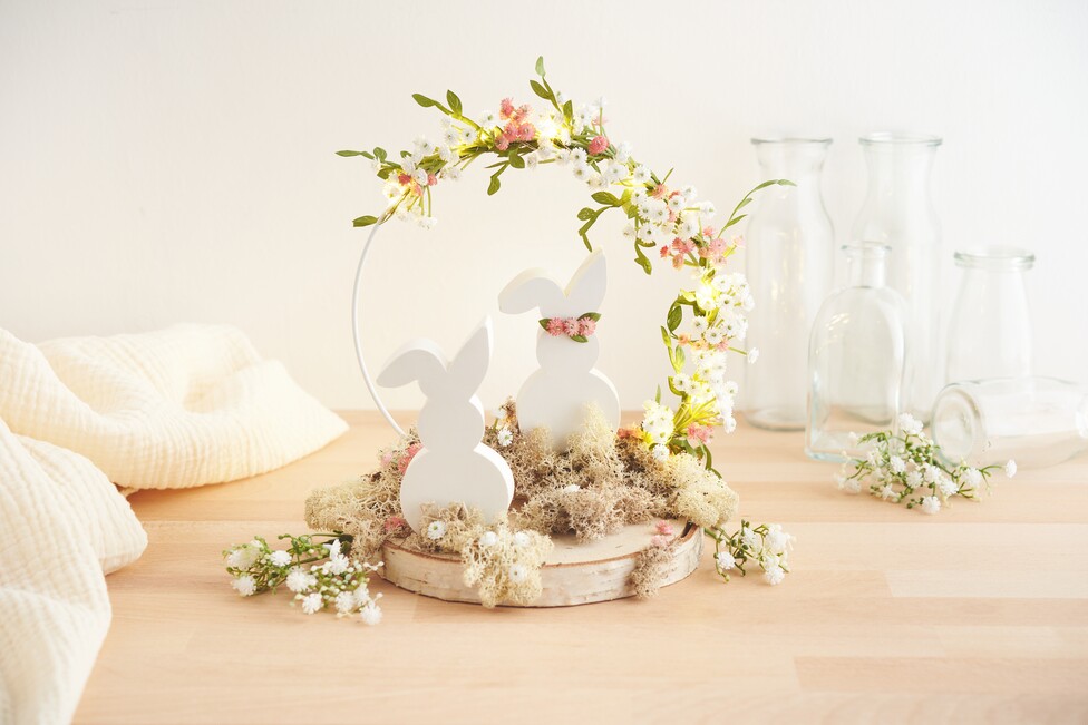 Na jednoho ze zajíčků přilepte malý věneček z květin a oba odlitky zajíčků pevně připevněte k březovému disku pomocí horkého lepidla. Nakonec můžete na březový disk přilepit islandský mech a několik dalších květin, abyste zdůraznili přírodní vzhled aranžmá.
