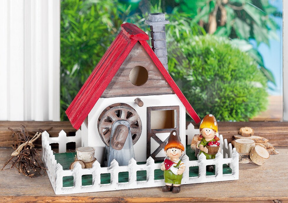 Přiložené dřevěné kolíčky vlepte do mlýna a komína trochou lepidla na dřevo. Nejprve domek a plot natřete bílou barvou. Po zaschnutí natřete střechu na červeno a základní desku na zeleno. Komín a držák mlýna natřete šedou barvou a mlýn, dveře a horní polovinu domku natřete směsí hnědé a bílé barvy. Pro efekt dřeva přetřete trochu černé barvy. Pomocí vlhké houbičky a černé barvy dodejte střeše domu a plotu efekt dřeva.