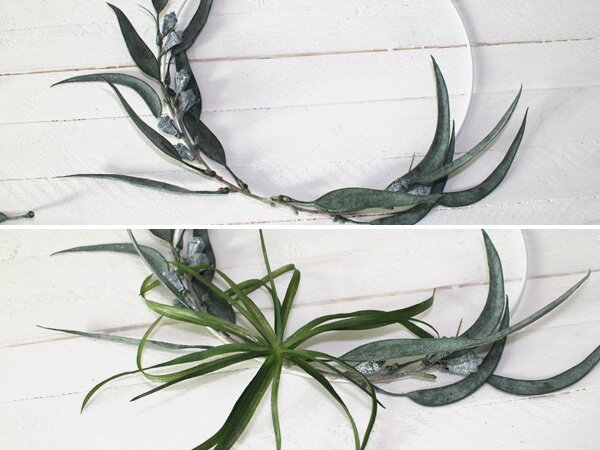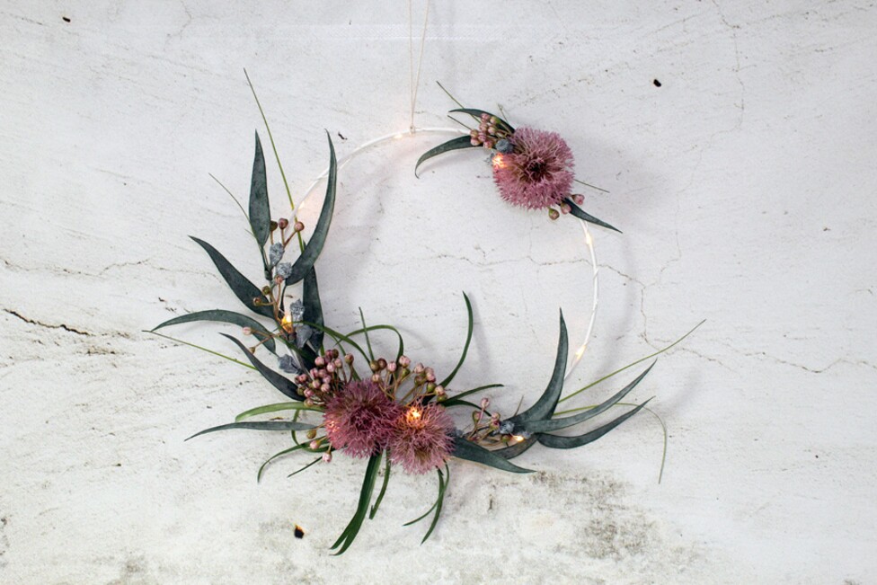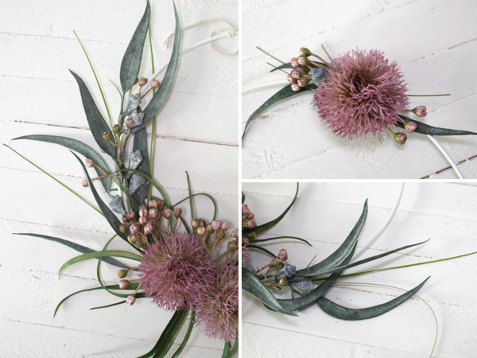 Než začnete, připevněte ke kovovému kroužku kousek stuhy, šňůrky nebo podobného materiálu, abyste později vždy věděli, kde má být vrchol. Pomůže vám to v orientaci při lepení jednotlivých prvků. Poté pomocí bočního řezáku nařežte květy a listy na jednotlivé kousky. V některých případech stačí květy odlepit až po jejich přišpendlení. i tak byste však měli odstřihnout všechny vyčnívající konce.