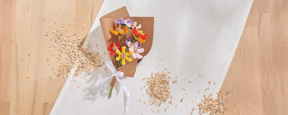 Nyní připevněte žinylkové drátky k zadní straně květů pomocí horkého lepidla.